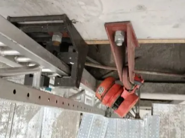爬架电动葫芦悬挂在提升钢梁上,而提升钢梁则用提升拉杆和穿墙连接螺栓固定在建筑物上,电动葫芦整体提升承力托,带动爬架上升,导向轮和导向杆起着防止外架倾斜和起着垂直升降导向作用。